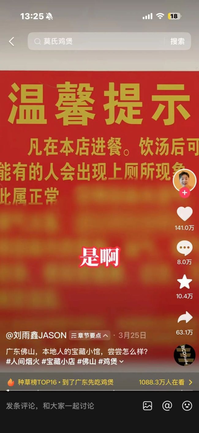 近日,位于广东佛山市顺德区陈村镇绀现村的一家鸡煲店意外走红。这家名为莫氏鸡煲的小店因为一则美食博主的探店视频迅速吸引了大量食客。
