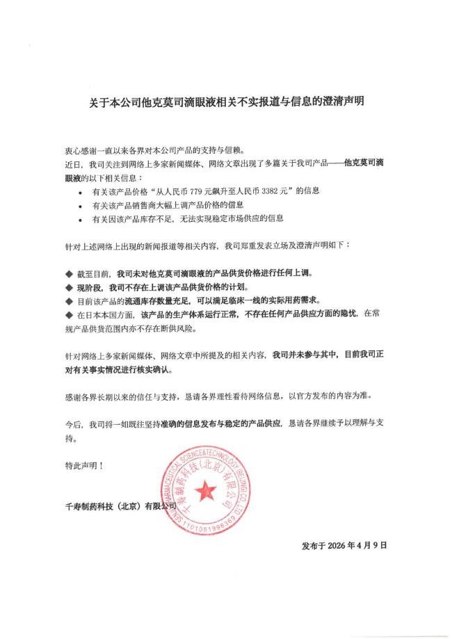 4月9日晚,千寿制药科技(北京)有限公司发布澄清公告,称截至目前,公司未对他克莫司滴眼液的产品供货价格进行任何上调。现阶段,公司不存在上调该产品供货价格的计划。目前该产品的流通库存数量充足,可以满足临床一线的实际用药需求。