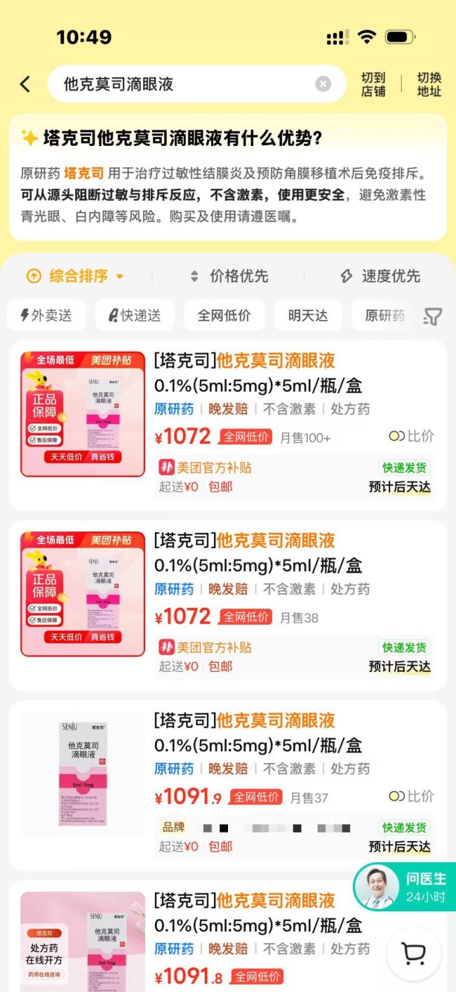 在美团外卖和淘宝软件上搜索“他克莫司滴眼液”,目前价格大多集中在1000-1300元之间,状态均显示现货,甚至有商家表示6小时内即可发货。