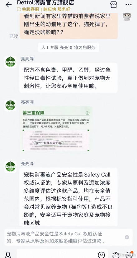 4月9日,滴露官方回应称对幼猫死亡深表痛心,但因缺乏尸检报告和兽医诊断证明,目前无法确认产品与幼猫死亡之间存在因果关系。4月14日晚,滴露天猫官方旗舰店客服表示,这款消毒液专为养宠家庭设计,幼猫家庭可以放心使用。