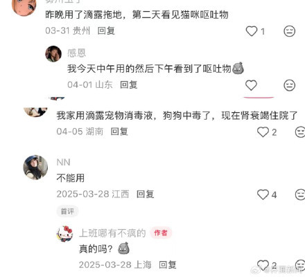 滴露宠物消毒液致幼猫死亡!近日,有消费者反映使用滴露宠物消毒液拖地后,家中5只幼猫死亡。宁夏的陈女士表示,4月6日下午她按照产品说明稀释了滴露宠物专用消毒液并拖地,同时保持室内通风。此前她家中的成年猫使用同款产品并未出现异常。当晚11点,她发现两窝共5只幼猫全部死亡。这些幼猫在事发前健康活泼,仅食用母乳,当天家中唯一新增的行为是使用了该消毒液,因此她怀疑幼猫死亡与消毒液有关。