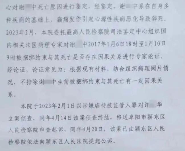 转狱后仅19天,谢某中突然发病,送医后抢救无效死亡。谢先生对父亲的死亡存在质疑,持续向检察机关控告。阜阳市颍东区人民法院的刑事判决书显示,2017年1月6日,许某华安排值班罪犯对谢某中进行约束。值班罪犯用自制约束带将谢某中双手、双脚、膝盖捆绑约束至十四监区二楼病房内床上。1月7日谢某中曾被短暂解除约束,但在洗澡后又被继续约束在原来的病床上,一直到1月10日许某华值主班。当日9时许,谢某中被解除约束,后被两人搀扶至卫生间洗澡。11时许,谢某中由其他罪犯用担架抬入第十三监区服刑。1月12日、13日、14日,谢某中因病去监狱医院治疗。1月15日1时10分左右,监室值班罪犯发现谢某中呼吸困难、抽搐,随后用担架将其送至监狱医院进行抢救,最终宣布临床死亡。