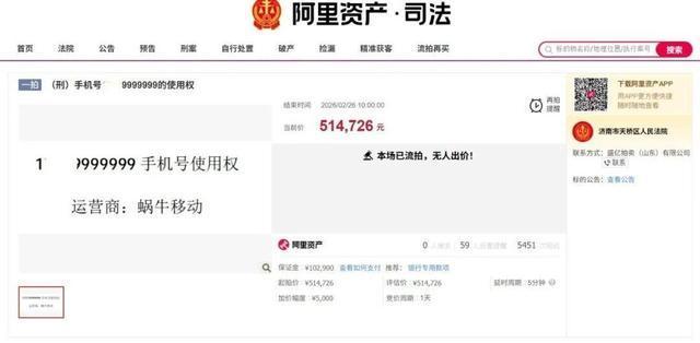 4月25日,从阿里司法拍卖平台了解到,尾号“9999999”的手机号即将以26万余元的底价挂网进行拍卖。该手机号曾于2月26日以51万余元的底价挂网进行拍卖,但在24小时的拍卖周期内因无人出价导致流拍。