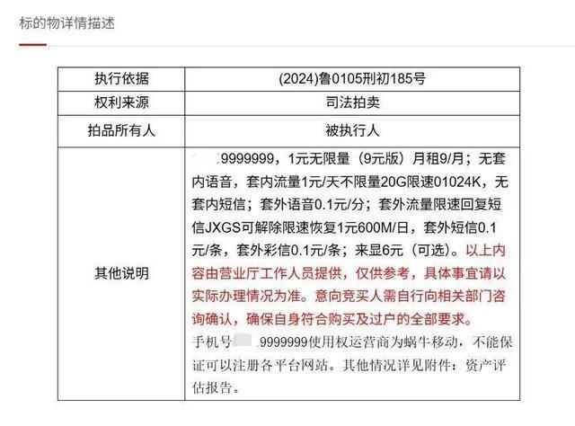 此次拍卖的手机号为179999999,号码运营商为蜗牛移动,起拍价为266833.8元,起拍日期为4月29日10时。该号码的月租仅为9元,无套内语音,套内流量1元/天不限量,无套内短信;套外语音0.1元/分钟。