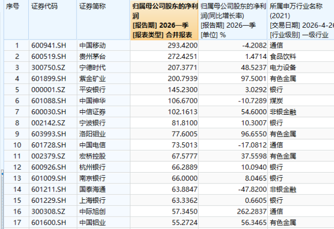 在已披露业绩的上市公司中,有17家公司一季度归属母公司股东的净利润超过50亿元,主要来自银行业、有色金属业、通信业及非银金融业。其中,中国移动、贵州茅台、宁德时代、紫金矿业这四家公司的净利润均超过200亿元,日均净利润分别为3.26亿元、3.03亿元、2.30亿元和2.23亿元。