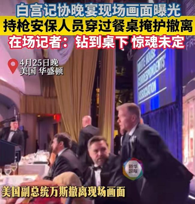 法新社和美国有线电视新闻网在当地时间25日晚发布了该事件的现场视频。视频显示,手持枪械的安保人员跨越多个餐桌前往主席台,护送政要撤离现场。美国总统特朗普和副总统万斯在安保护送下撤离。