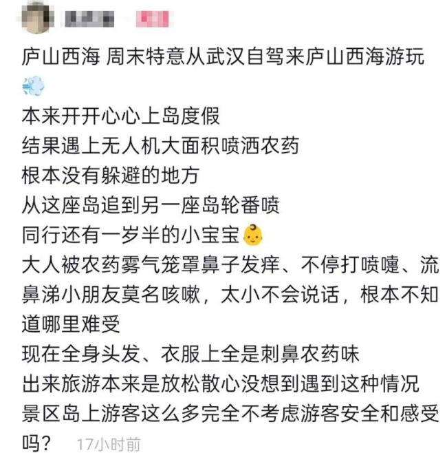此前,有网友发布消息称,在江西九江庐山西海景区游玩时,看到一架无人机以较低的高度掠过,疑似喷洒不明物质,期间有游客被喷到。该网友描述自己和家人在度假时遭遇无人机大面积喷药,感到非常无助,称大人鼻子发痒、不停打喷嚏,孩子莫名咳嗽,全身头发、衣服上都是刺鼻的农药味。