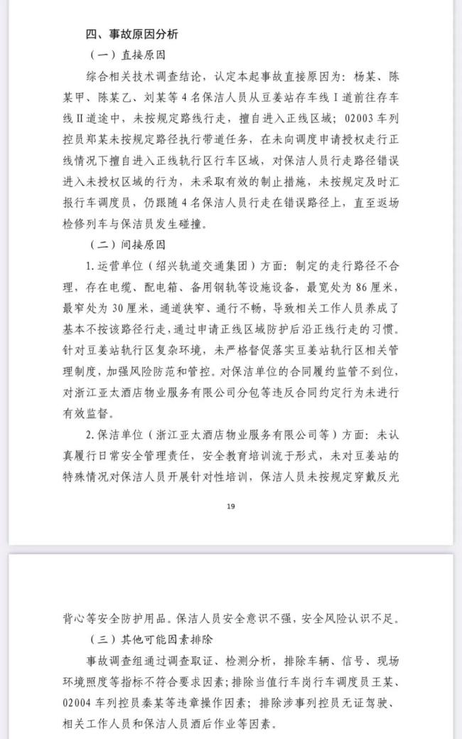 调查认定,绍兴市“9·13”轨道交通较大事故是一起因涉事企业安全风险辨识管控不到位、从业人员违反安全操作规程等导致3人死亡、1人重伤的生产安全责任事故。