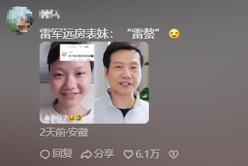 【女孩因长相酷似雷军走红】8月12日,女孩因长相酷似雷军在网络引起关注,截至目前视频点赞数已超9万。
