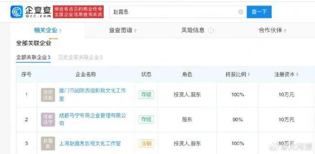 此外,据企查查平台信息显示,赵露思名下关联有3家企业,其中在今年8月成立的成都马宁有限企业管理有限公司中,她持股90%。