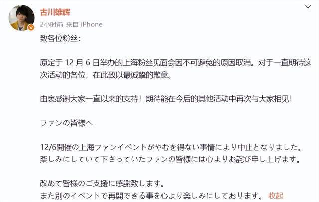 原定于12月6日举办的上海粉丝见面会因不可避免的原因取消。对于一直期待这次活动的各位,主办方表达了最诚挚的歉意,并感谢大家一直以来的支持,期待未来能在其他活动中再次与大家相见。