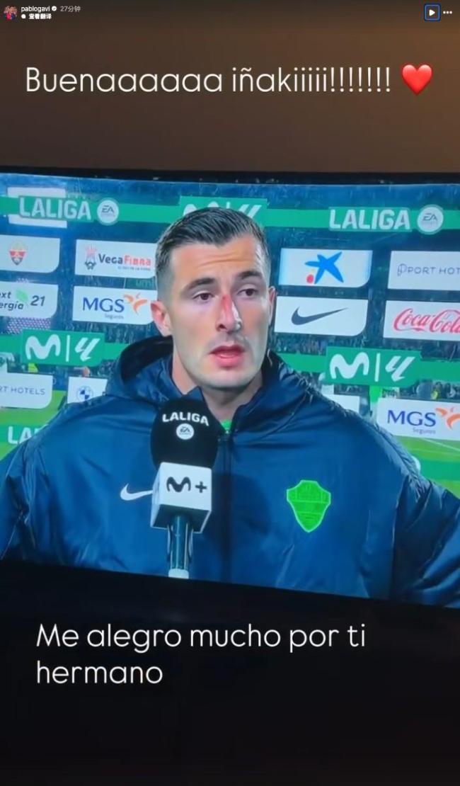 比赛结束后,加维在社交媒体上晒出了佩尼亚接受采访的画面,并写道:“太棒了,伊尼亚基!!!!!!!️ 兄弟,我真为你感到高兴。”