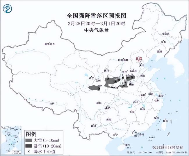 中央气象台2月28日18时发布暴雪蓝色预警,预计2月28日20时至3月1日20时,甘肃东南部、陕西中部、山西南部、河北西南部、河南北部和西部等地的部分地区有大雪,局地有暴雪(10~15毫米),上述地区新增积雪深度2~8厘米,局地可达10~15厘米。