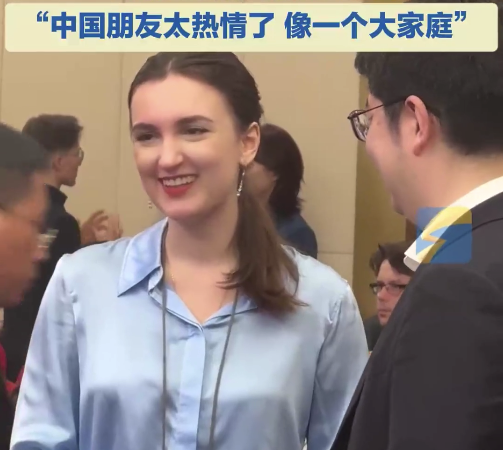 3月8日,北京,十四届全国人大四次会议外交主题记者会现场,俄罗斯记者阿丽娜接受采访时表示,自己首次参与报道两会“太紧张”,结果发现无论自己去哪儿都会有人帮忙,“中国朋友太热情了,像一个大家庭。”