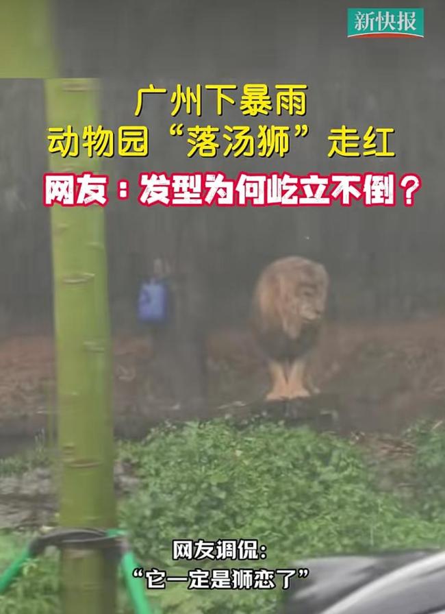 广州暴雨过后网友拍下搞笑一幕狮子淋雨发型不塌。3月29日,广州遭遇强对流天气,有网友拍到长隆野生动物世界里一头狮子淋雨的视频,称“像是有什么心事一样,让人觉得心酸又搞笑”。不少网友调侃:“它一定是狮恋了”“狮子:哎…点解落雨都要翻工”“它是怎么做到淋雨发型不塌的”。